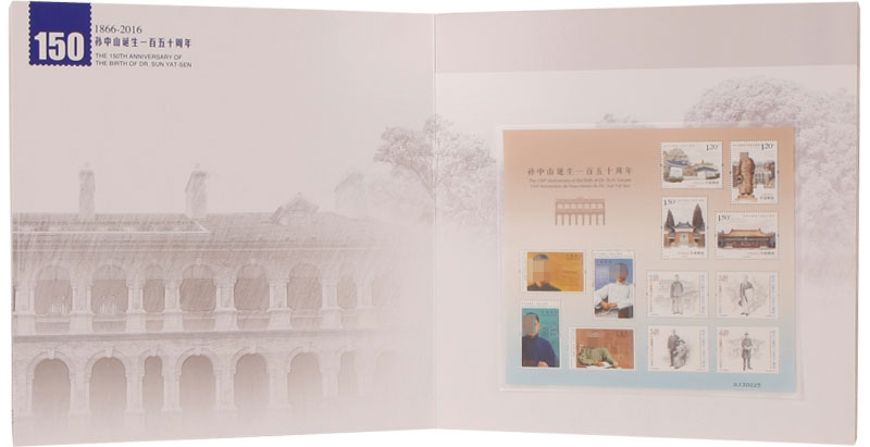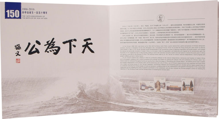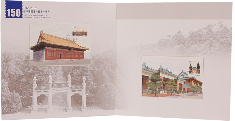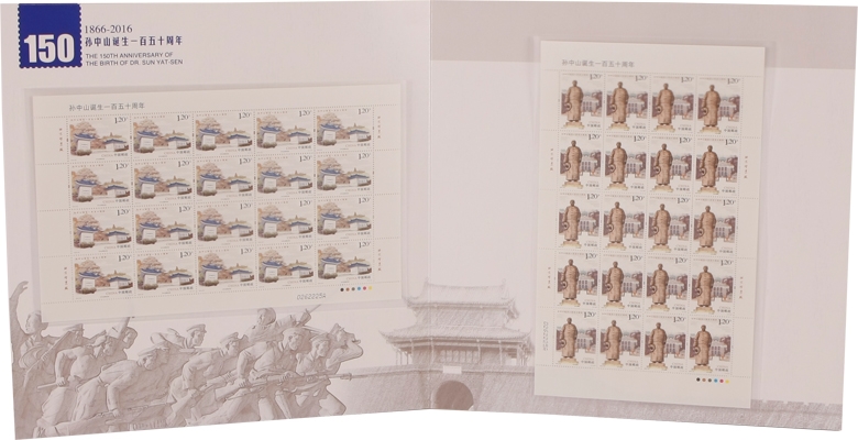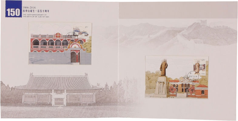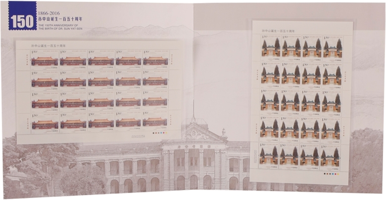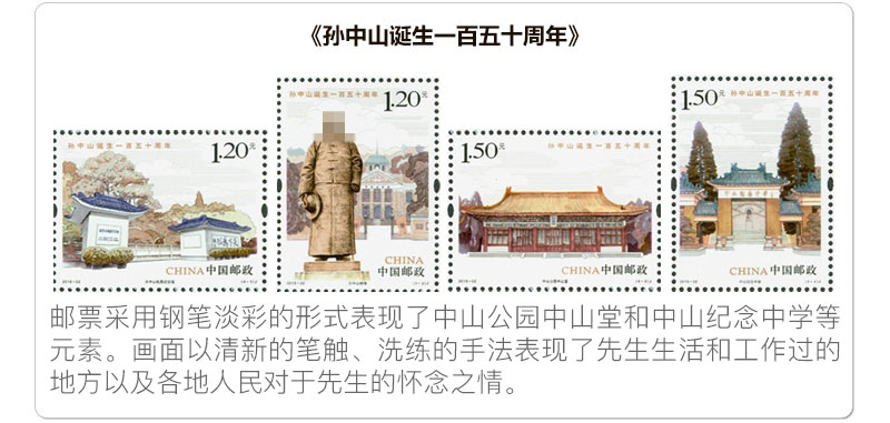 中国邮政定于2016年11月12日发行《孙中山诞辰一百五十周年》纪念邮票1套4枚。票面分别展现了孙中山故居纪念馆、孙中山铜像、中山公园中山堂 、中山纪念中学。该套邮票单枚面值为1.2元和1.5元两种,规格40×30mm、30×40mm,由李可心设计,北京邮票厂印刷。